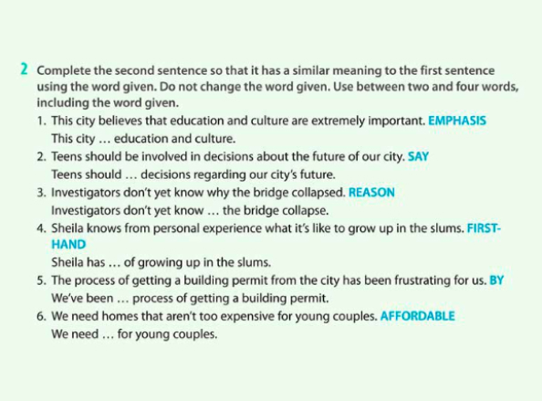 In Murcia, a new task has been introduced in the Reading section of the exam: “Find words or expressions that match the definitions.” Apart from this addition, the structure of the exam remains unchanged. The Reading section still includes true / false evidence questions, multiple-choice questions, and paraphrase completion. The Use of English section continues to feature text completion (multiple choice) and sentence transformation tasks, while the 150-175-word written production task remains.